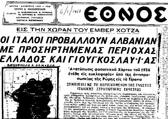 «Οι Ιταλοί προβάλλουν Αλβανία με προσηρτημένας περιοχάς Ελλάδος και Γιουγκοσλαβίας. Ανατύπωσις φασιστικού χάρτου του 1938 ετέθη εις κυκλοφορίαν υπό της αντιπροσωπείας της Ρώμης εις τα Τίρανα. Συμπίπτει με το περιεχόμενο της γνωστής ιταλικής στρατιωτικής εκθέσεως».