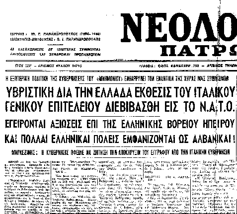 «Ο δημοσιογράφος του «Έθνους» κ. Ηλίας Π. Δημητρακόπουλος(*), αποκάλυψε την 29η Μαΐου 1960 την ύπαρξη και αποστολή από την ιταλική κυβέρνηση, άκρως εμπιστευτικής έκθεσης του ιταλικού Γενικού Επιτελείου Άμυνας που αφορά στην Αλβανία, προς το ατλαντικό Αρχηγείο στο Παρίσι. Η εντύπωση που προκλήθηκε τόσο στην Ελλάδα όσο και το εξωτερικό, από το περιεχόμενο της απιστεύτως ανακριβούς, κακοηθέστατης και ανθελληνικής αυτής έκθεσης της Ρώμης, υπήρξε συγκλονιστική. Προκάλεσε την εξέγερση της ελληνικής κοινής γνώμης και πολυάριθμα συλλαλητήρια, σ’ ολόκληρη τη χώρα».